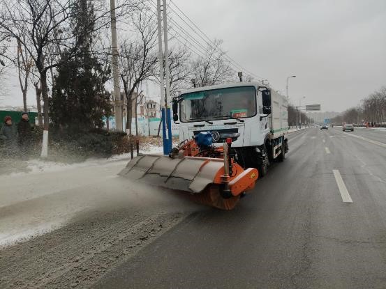 公司迅速集結(jié)23名工作人員,調(diào)配除雪車、融雪劑灑布車各1臺(tái),前往渤海十三路(黃河一路至黃河二路段)開展開除雪作業(yè)。
